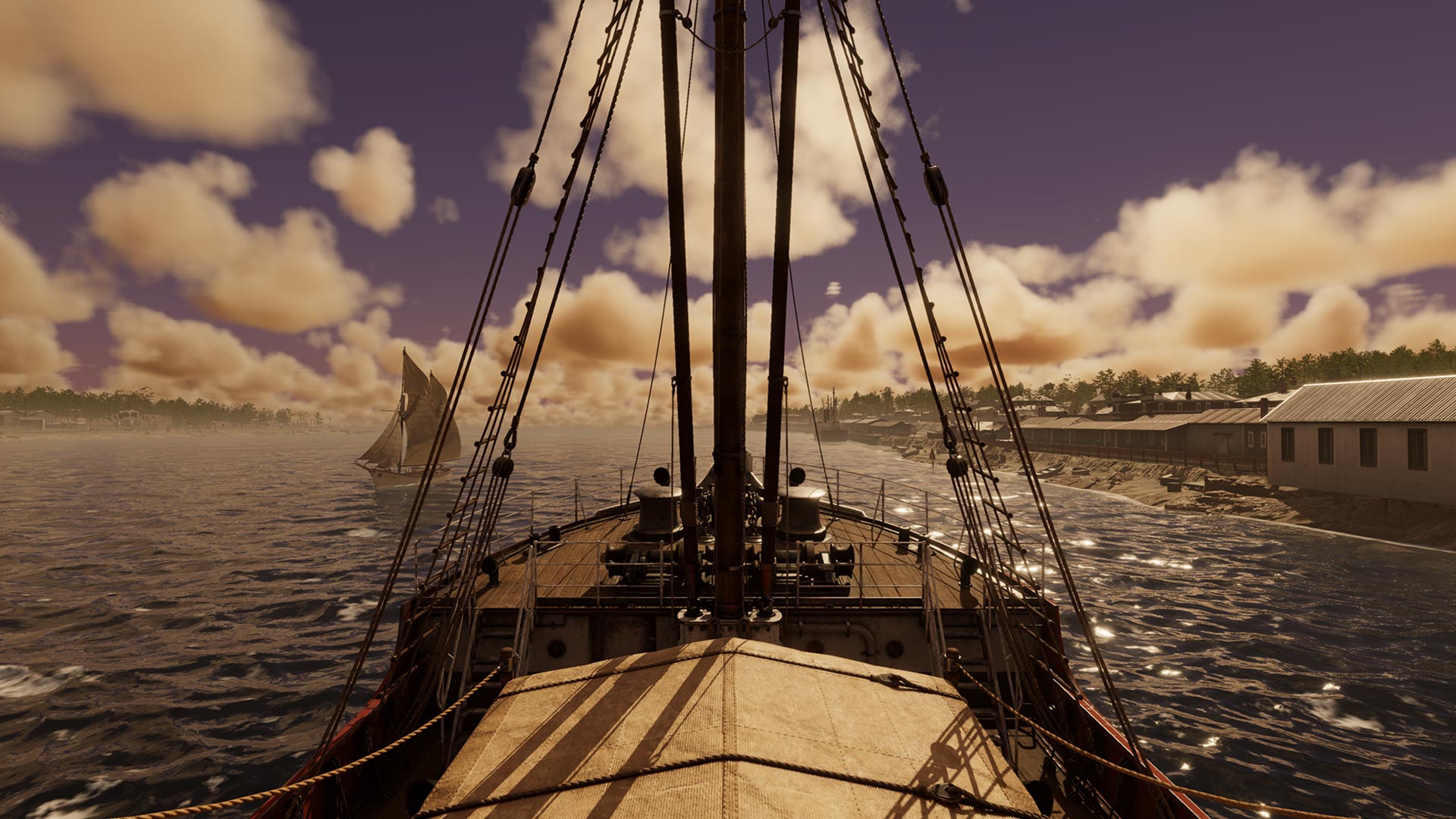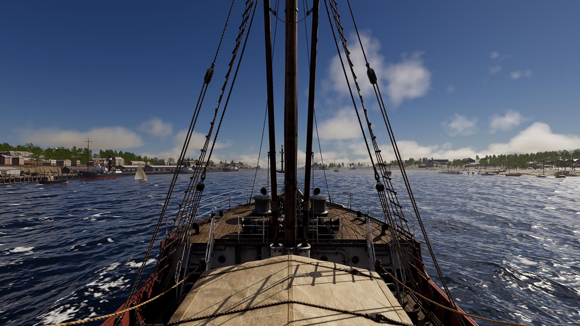 To bring the world of 1920s Devonport to life, we created over 100 unique in-game assets that filled the harbour with period-accurate texture and charm. Beyond buildings and vessels, we added animated characters working along the docks and aboard ships – adding movement and human presence to the environment. Dolphins and whales help liven up the waterline, while carefully placed props – crates, barrels, signage, and tools – anchor the scenes in the right historical feel.