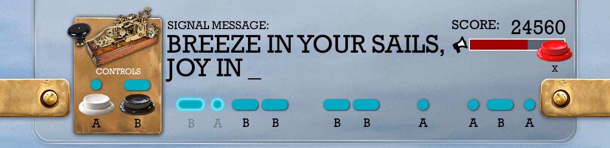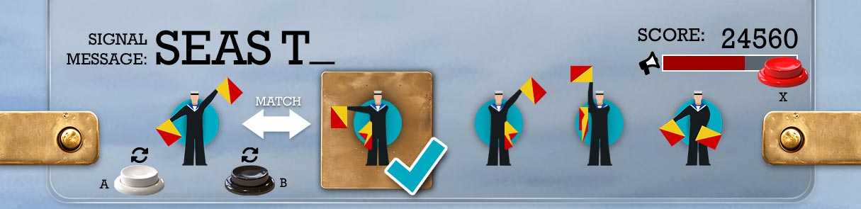 Using directional input, players adjust a sailor’s arms to match classic semaphore flag signals.
