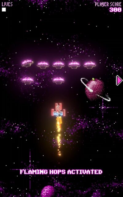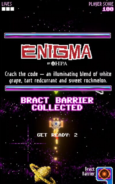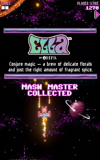 Visually, the game leaned into chunky pixel shapes and retro graphics, but modernised them with sleek lighting effects and crisp animation. Everything from the explosions to the spacecraft trails had a bit of visual punch, balancing nostalgia with polish. Players controlled a little pixel spacecraft flying through deep space, fending off wave after wave of enemy attacks. Classic stuff – but here’s the twist: along the way, players could pick up powerups, each one themed after a different hop flavour. Each powerup boosted firepower or shield strength, just like in a classic arcade game, while sneakily educating players on hop profiles and beer characteristics.