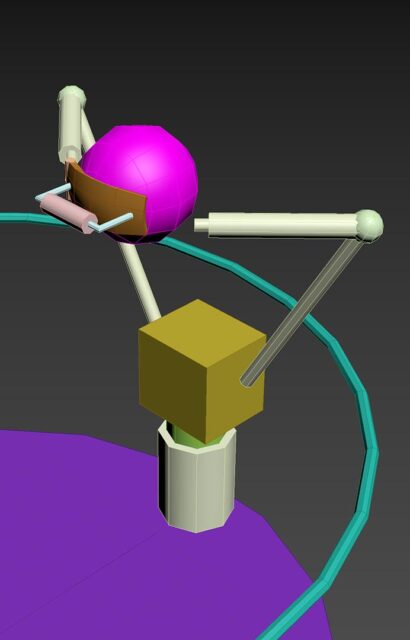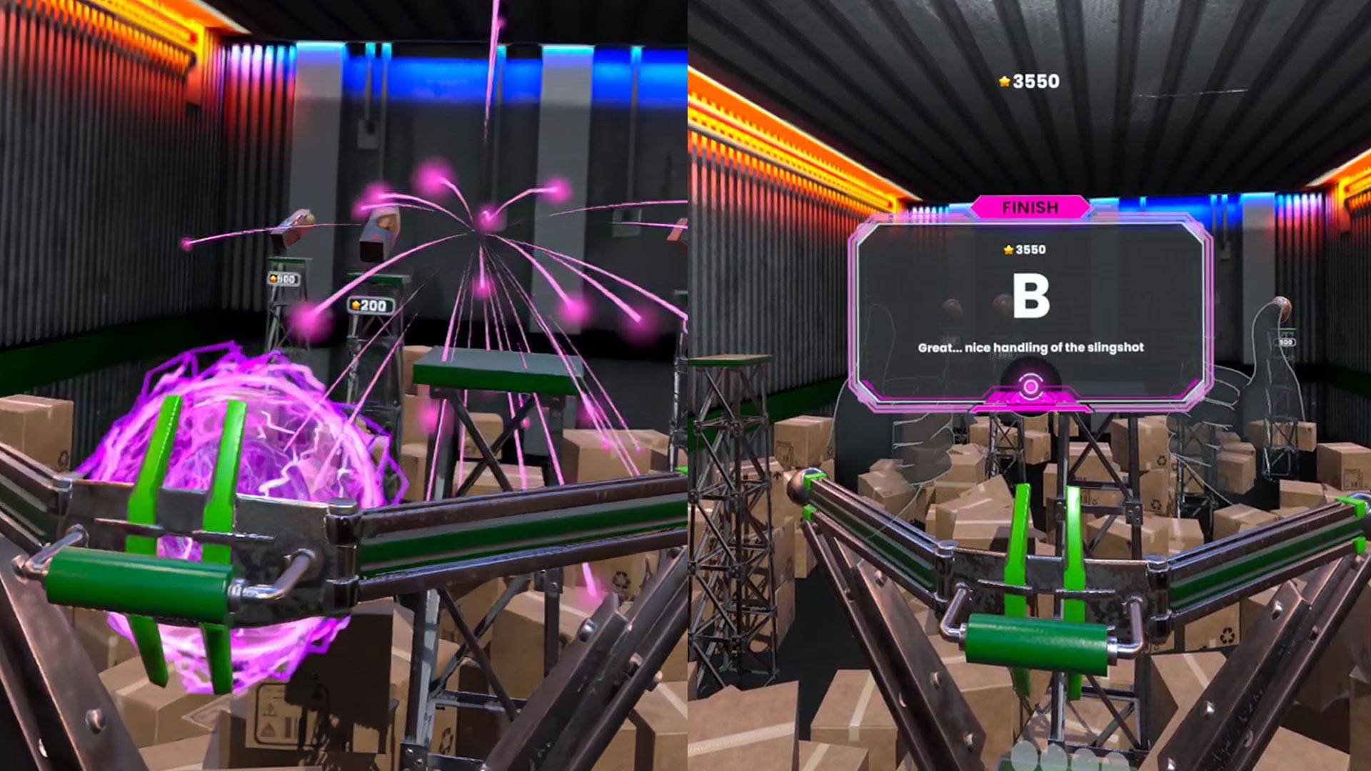 No controllers required. Using the Meta Quest’s hand-tracking technology, players interact directly with the game using their own hands. The slingshot itself is a chunky, sci-fi-inspired launcher with mechanical parts and pulsing energy cores. As players reach out and pull it back, a glowing trajectory path appears, helping them line up the perfect shot. It’s intuitive, responsive, and gives a real sense of power in the hands.